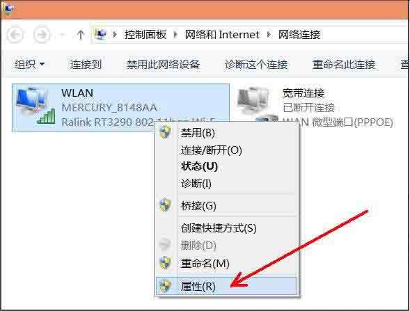 3、右击“WLAN”图标,然后点击“属性(R)”按钮(如果连接的是网线的话,就右击“本地连接”图标,点击“属性(R)”按钮);