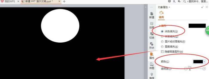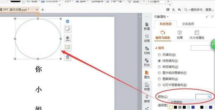 在设置这个形状的属性,填充成白色,选择无线条把这个圆形变成一个透明写圆形形状