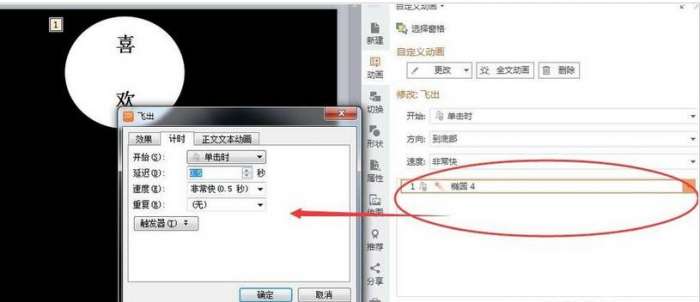 选中这个圆形,点击菜单栏自定义动画,设置一个动画效果,我们选择飞出效果,如图