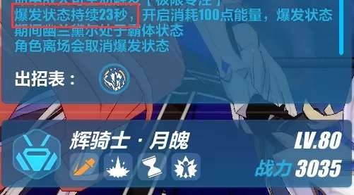 月魄是3.9版本中持续输出时间最长的角色之一,打输出的时间长达令人发指的23秒。其他长时间输出的角色,理律骑半天摩托也就17秒,玫瑰开大20秒开始快速掉血,也就120SP以上的月轮、烧光两条律者能量的空律能与之媲美了。