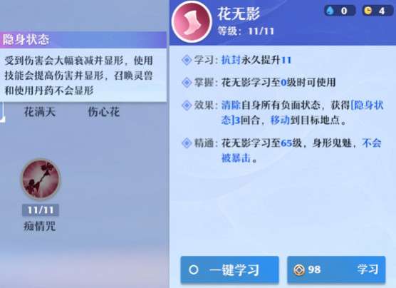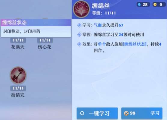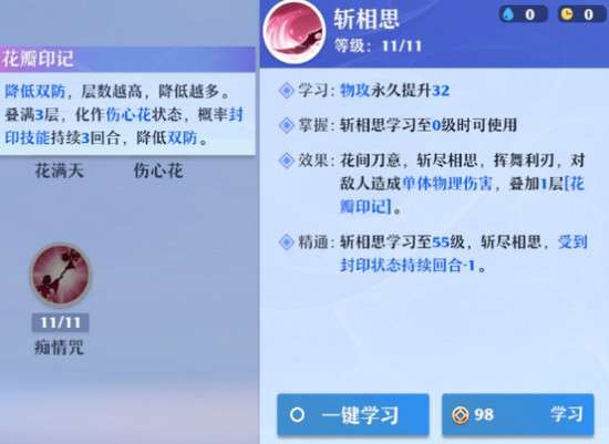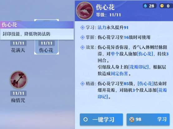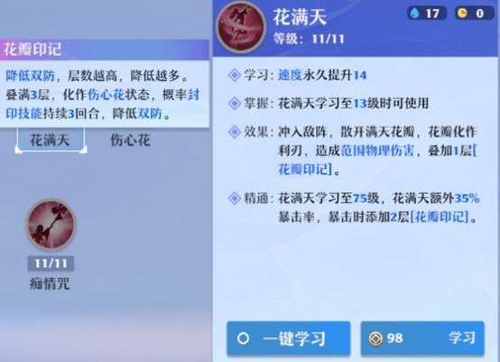 合欢的大多数攻击会给敌人叠加花瓣印记,叠满3层印记=封印。