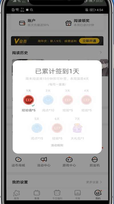 4、找到签到规则,周末阅读超过十五分钟后即可再次点击签到进行补签