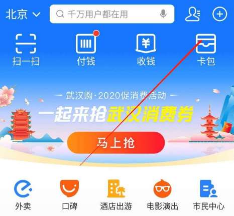第一步,登陆手机支付宝APP,点击首页面中的卡包选项,如图所示: