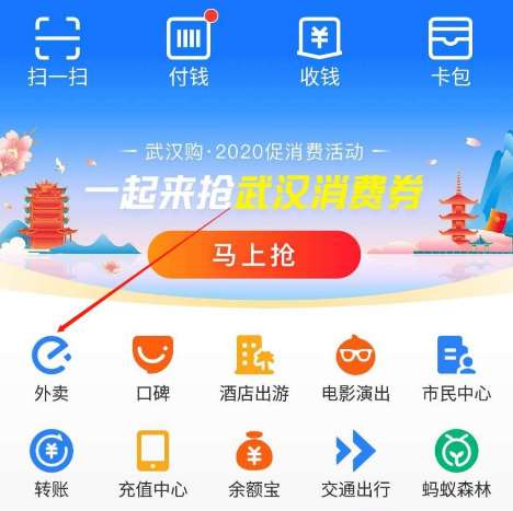 第四步,如果不是在实体店进行消费,可以在支付宝中点击消费类功能,如点击首页中的外卖,如图所示: