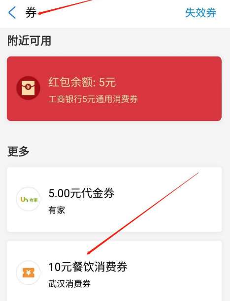 第二步,进入卡包后,点击券,可以查看领取到的消费券,查看消费券面额和使用条件,如图所示: