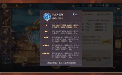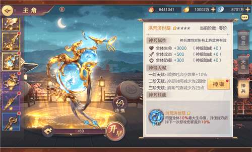 与其他神兵不同的是洪荒济世葫没有任何输出能力,效果为恢复全体10%的最大生命值,并为后排的下次怒攻伤害提升10%,升星之后只是多了一个驱除减益的效果。