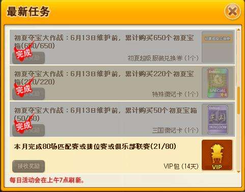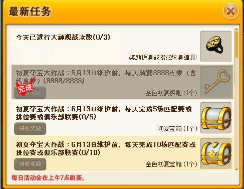 每日只要完成5场比赛(正常结算的匹配赛/排位赛/俱乐部联赛)可以领取初夏宝箱*1。每日只可完成一次。每日完成10场比赛(正常结算的匹配赛/排位赛/俱乐部联赛)可以领取金色初夏宝箱*1。每日只可完成一次。每日消费8888点券(含代金券)可以领取金色初夏钥匙*1。以上每日只可完成一次,每日7点刷新任务。