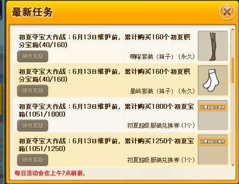 账号累计购买1250个初夏宝箱可以领取初夏超级服装兑换券*1。只可完成一次。