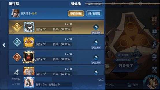 在镜像战中使用同一英雄获得30连胜:获得称号“威震天下”4.镜像战排行榜