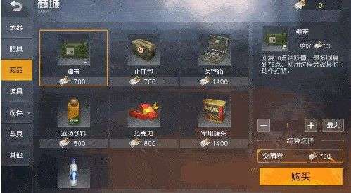 商城中可以选购的物资包括武器、防具、药品以及各种道具,同时也可以购买各种枪械配件以及组装载具所需的各种配件;同时还可以购买服饰、对讲机(用以将信息发送给其他玩家)等。