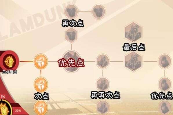 这里后撤动作很重要,所以要先把动作点出来。然后在这个后撤动作的基础上,如果你想早点玩后撤三分投篮,那就早点把【三分瞬狙】点出来。不然就按照正常顺序,先点晃倒,然后点晃倒后的命中提升,再然后是【三分瞬狙】。