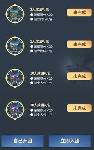 首先想要领取成团礼包,必须购买S20战令的【进阶卡】或者【典藏卡】,如果你的战令属于普通版,自然是无法入团成为合伙人的一员。满足条件后,点击自己开团,或者立即入团按钮即可。