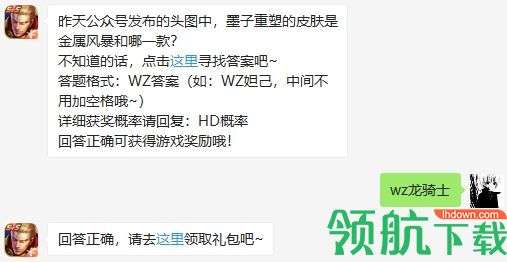 今天王者荣耀每日一答的题目是:昨天公众号发布的头图中,墨子重塑的皮肤是金属风暴和哪一款,下面小编为大家带来今日份答案,每日持续更新,欢迎大家继续关注我们!