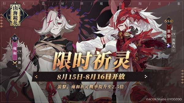 情报详情:本次旅途8月15日至8月16日开放【SSR镜灵-蚩黎】【SR镜灵—雍和】限时祈灵,且SSR镜灵蚩黎祈灵概率提升至2.5倍,SR镜灵雍和祈灵概率提升至2.5倍。
