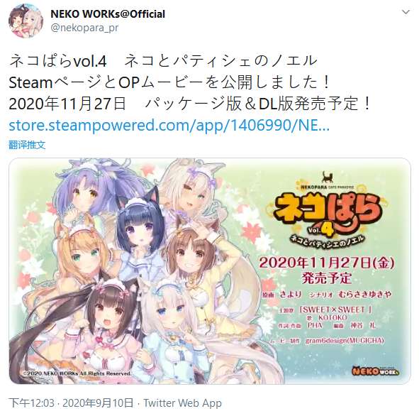 今日(9月10日),《巧克力与香子兰》系列开发商NEKO WORKs正式宣布:新作《巧克力与香子兰4》将于2020年11月27日正式发售,支持繁体中文。目前官方还公开了一段OP动画和中文介绍内容,以下为具体细节。