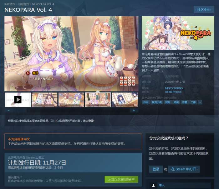 新作《巧克力与香子兰4》将于2020年11月27日正式发售,支持繁体中文,感兴趣的玩家可以获得Steam商城链接。
