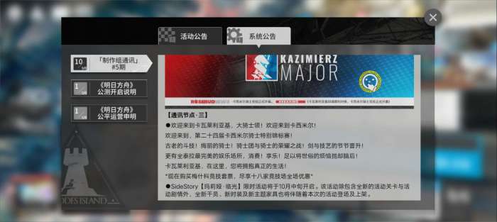 紧接骑猎复刻,十月下旬还会有全新的SideStory,故事背景为第二十四届卡西米尔骑士特别锦标赛。虽然不知道比赛的由来以及前二十三届的故事,但这一届我们将由于干员临光的缘故接触到这项盛大的赛事,而故事名玛利亚·临光有可能就是她档案中所提及的妹妹。从描述来看,故事的主基调似乎就是一场狂欢的盛宴,但也不排除鹰角藏刀的可能性,毕竟“轻松愉快”这四个字大家都懂。