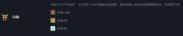 10.21宗师羁绊加强,3宗师就能降低敌方4秒得攻速,降低敌方攻速就是变相增加我方阵容攻击频率,蓝量就增长就能在4秒内比敌方快一倍而更快得释放技能,更关键得是宗师羁绊得效果属于控制效果。而版本强势的天神狼更是针对于此而诞生。