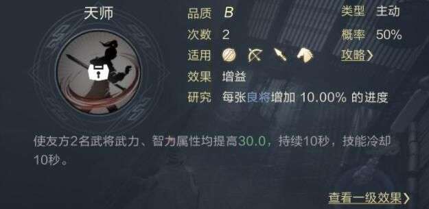 天师:最强B级技能,平民首日开荒必带,阚泽这个蓝色武将只能在群雄争霸里抽到。 击虚:武力技能,前期没有A级武力技能可以用这个过渡。