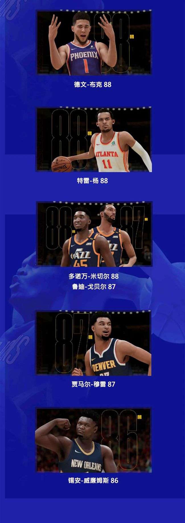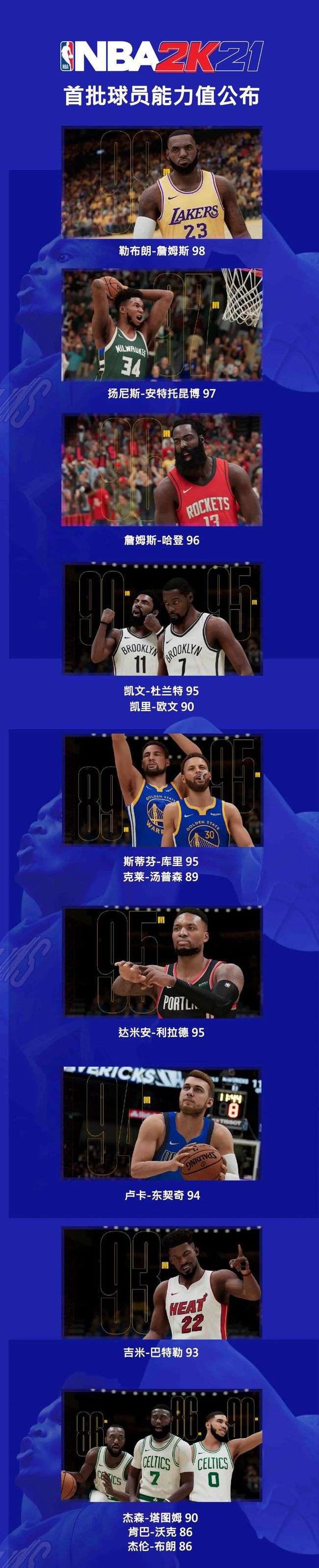 NBA2K21能力值曝光,詹姆斯联盟最高98,字母哥97,浓眉96,哈登96,伦纳德96,杜兰特95。你没看错,KD排第六!库里和利拉德都是95,东契奇94,巴特勒93!其他球员如下图所示……