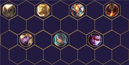 皎月女 神-黛安娜、腥红收割者-弗拉基米尔、诡术妖姬-乐芙兰、岩雀-塔利亚、复仇炎魂-布兰德、邪恶小法师-维迦、永恒梦魇-魔腾、暗黑元首-辛德拉(6魔法师3刺客2海洋)
