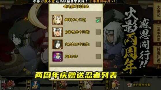 在前面这四个1月份周年庆的情况来看,只有2017年的一周年庆算是开了一个好头,因为2016年12个月里,每个月都会有一个全新的限定忍者,所以2017年的一周年庆就是从这12个限定忍者里面任选其一,当初这个活动也被玩家称为是最良心的活动。而到了2018年的1月份两周年庆就开始缩水了,虽然还是送了限定忍者,但只有B忍的木叶三忍任选其一,范围也变得小了很多,不过,毕竟是免费领取,玩家们还是能够接受的。