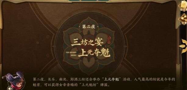 这一部分玩家将会游览上元之夜的长安城中的重要场景,包括长乐坊、曲池坊、郢酒坊三个场景。