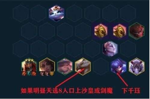 如果是明昼天选或猫咪秘术天选,8人口还可以挂永恩或者沙皇,沙皇>永恩。沙皇有2个小弟沙兵,我们阵容无前排,这样可以为猫咪分担一部分压力。如果时光2星替换风女可考虑上剑魔,剑的控制非常足,特别是缩角站位的直接拉出来,劫就能先杀掉。