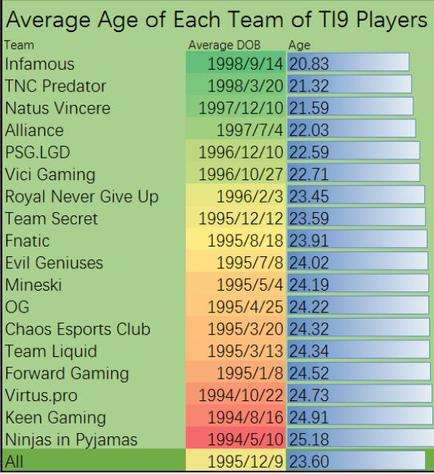 对于各大战队来说,最大的敌人可能不是对手,而是年龄。在TI9时曾经有人统计了所有战队的平均年龄,如下图所示。TI虽然停滞,但时间不会停滞。所以,如何解决这个问题就成为了各大战队的重中之重。南美和东南亚拥有充足的人才储备,所以他们并没有大刀阔斧地换人。就算是把平均年龄再加上1.5,beastcoast(前Infamous)和TNC的年龄结构依然非常健康。