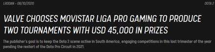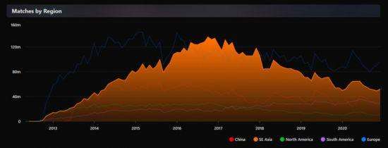 实际上,南美赛区一直是V社努力扶持的赛区。尤其是2020这个G胖高强度在新西兰晒太阳的一年中,V社几乎是完全让第三方赛事机构自力更生——除了南美。V社曾经资助南美的Movistar Liga Pro Gaming,让他能够一直把比赛办到DPC新赛季的开始。而南美赛区的玩家们也确实没有辜负V社的努力,在全世界DOTA玩家人数下行的大势之下,只有这个赛区的DOTA玩家数一直在稳步上升(上图紫色线)。