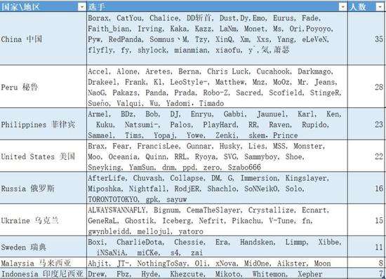 第一个问题当然是哪国贡献了最多的S级联赛选手。这个问题的答案是毋庸置疑的,作为唯一一个自成赛区的国家,共有35名S级联赛参赛选手来自中国。而第二名是哪个国家呢?这个问题的答案有些意料之外却情理之中——秘鲁。提起这个国家,想必所有有过美服游戏经历的玩家们都已经开始流冷汗了。ajajaja所到之处,整蛊操作数不胜数。不过秘鲁人的DOTA热情是不容置疑的,他们是南美赛区的核心力量。南美赛区有27位选手来自秘鲁,其中最为我们所熟知的当属K1大神。