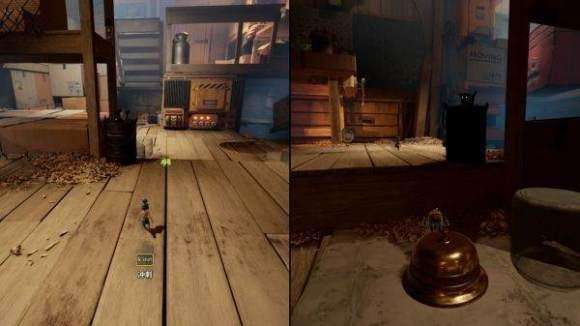作为3D平台冒险而言,地图设计很显然是相对于2D游戏来说有更大发挥空间的优势所在,很多游戏会以“成长系统”或者“特殊道具”作为探索的奖励,但在<双人成行>中,并没有这样强化“功能”的养成性,本作中对于探索的正反馈在于——大量有趣的小游戏或者互动物品,比如在上图的“打地鼠”小游戏中,章节中拿到了“锤头”的需要快速击打另一名从4个洞口随机钻出的,能够快速打到就可以得分,反之则是对方得分。