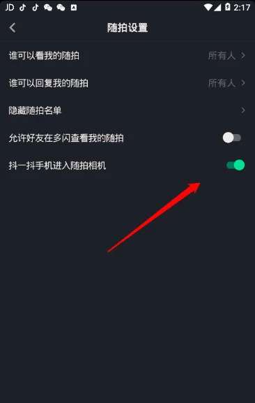 6、然后点击关闭抖一抖手机进入随拍相机开关,就完成啦