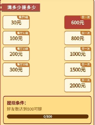 我玩的时候,开心餐厅有三种提现方式,一是打卡提现,二是餐厅到了规定等级,三是满一定金额提现。