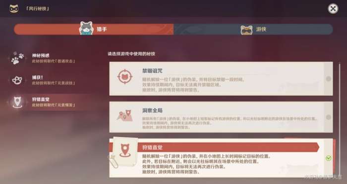原因:洞察全局虽然可以解除所有游侠的伪装,但你20秒也抓不了一个以上的人啊(除非对面被警告后还聚在一起),而禁锢诅咒虽然可以禁锢一个游侠但你还是只知道他的大概位置(特别是莫娜,对她来说解除伪装这个功能根本没用)。而狩猎直觉可以长时间解除位置并准确标记一个游侠的位置,让你稳定可以抓到一个*(*多数情况下)