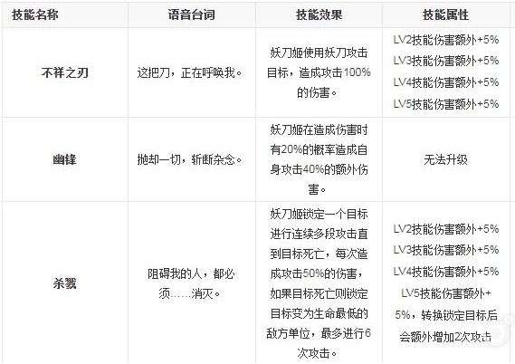不祥之刃:妖刀姬使用妖刀攻击目标,造成攻击100%的伤害。技能随着等级的增加而获得额外伤害。