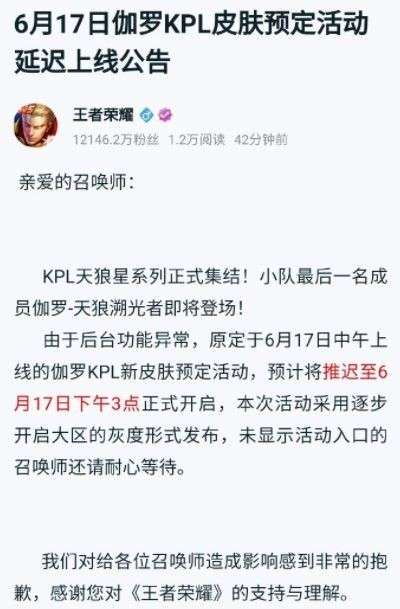 由于后台功能异常,原定于6月17日中午上线的伽罗KPL新皮肤预定活动,预计将推迟至6月17日下午3点正式开启,本次活动采用逐步开启大区的灰度形式发布,未显示活动入口的召唤师还请耐心等待。