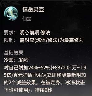 镇岳灵壶:对自己附加灵盾和明心(立即移除2个减益,在被定身或冰冻时也可使用),灵盾承伤不消耗真元