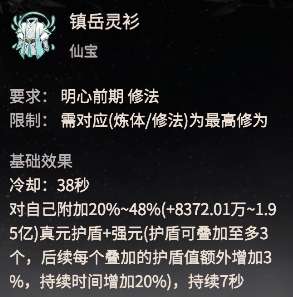 镇岳灵衫:对自己附加真元护盾和强元(持续时间内护盾可叠加,且护盾值和持续时间增强)