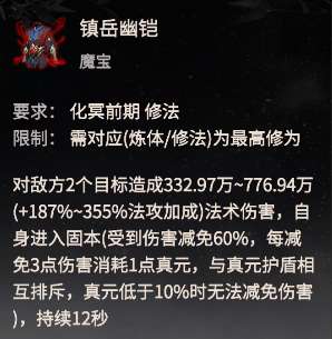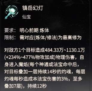 镇岳幻灯:对敌方1个目标造成伤害,自身进入魔焰(每个神通或法宝命中后,对目标叠加持续伤害)