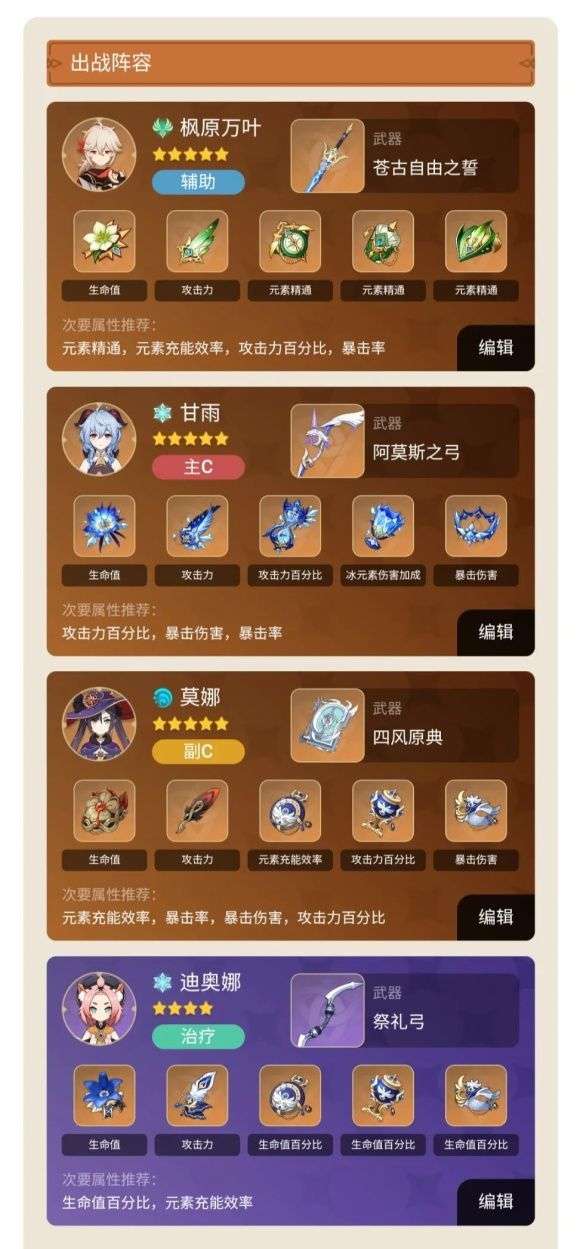 上文我们提到过万叶的一大优势——固有天赋2可以同时加成多种元素伤害,因此将万叶融入武装队是一个不错的选择。
