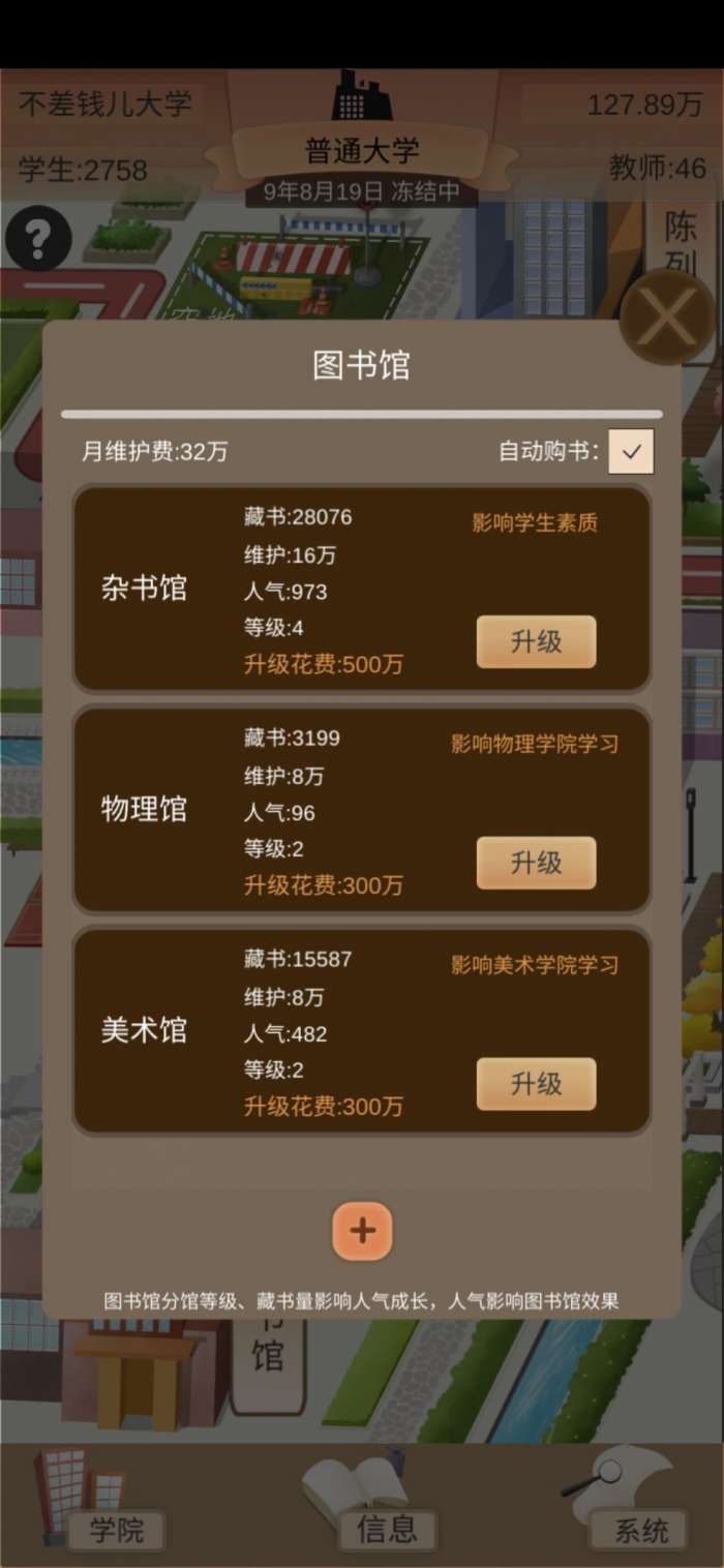 1)设施维护费,目前测试出来,设施对就业率和升学率的影响是最大的,但是维护费高昂,只有在升级学院以及就业率上不去的时候,再拉。另外,似乎设施数量也影响学生的成绩,这个不确定,第一个档我设施是拉满的,第二个档我只放了三个,等有钱了,我再测试。