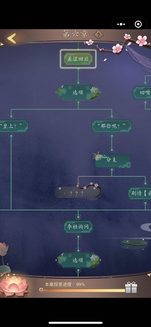 第七章很多提升好感的剧情,需要开启对应的条件,按照图示去找分支的时候花点金币解锁分支条件详情,另外王爷在本章的好感要求,分别要达到30及50,才能开启部分剧情哦。