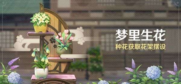 活动期间,在「咲耶」处兑换花种并种植「梦里花」,即有机会获得三种外观风格的「花架摆设」、原石等奖励。