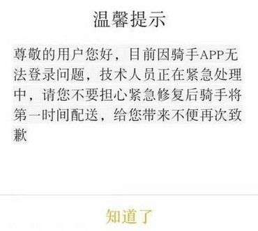 针对上述情况,美团在APP中表示,目前因骑手APP无法登录问题,技术人员正在紧急处理中,请您不要担心,紧急修复后骑手将第一时间配送,给您带来不便再次致歉。