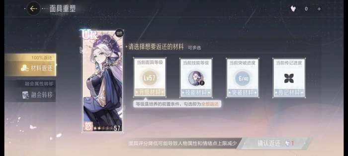 材料返还就是除了融会其他任何养卡材料都可以选择返还,每次返还需要一个意识胶卷,在商城用5w星币购买一个。