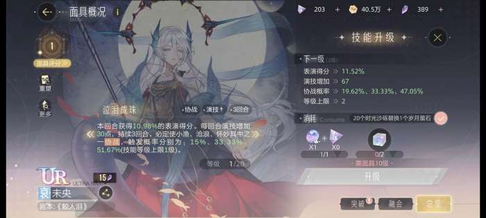 技能升级材料有岁月萤石和情绪奇想,20个时光砂砾可以合成一个岁月萤石,普通升级只需要岁月萤石就可以,每第三次升级会需要情绪奇想,情绪奇想只能在经典片段里面获得,每天30次次数不要浪费,尽量打后面的关卡。