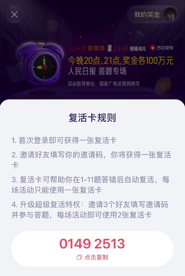 2、邀请好友,填写我们的邀请码,可以获得一张复活卡(每一个进入游戏问答的用户,只有一个邀请码,这个邀请码是不限量的,只要是使用了我们的邀请码都会获得一张复活卡);