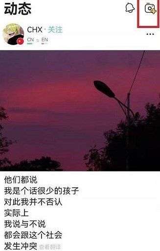 2、进入动态功能界面后点击右上角的拍照选项,点击后即可进入发布动态界面;