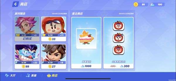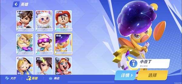 在游戏大厅左下角的“英雄”选项中可以选择玩家自己喜爱的角色,目前有9名角色可供玩家选择,每个角色都拥有不同的技能。玩家可以通过每局对战结束后获得的星星来解锁角色和奖励,除此之外还可以通过游戏币和星尘在商店内购买表情包等商品。
